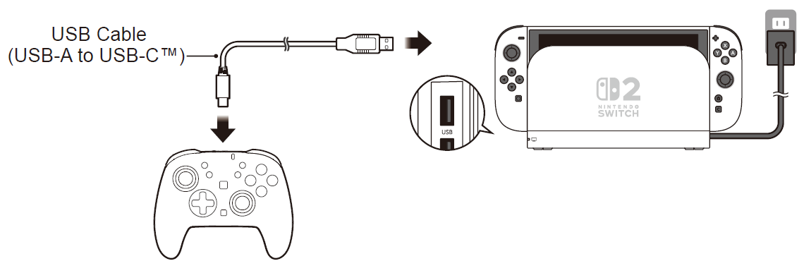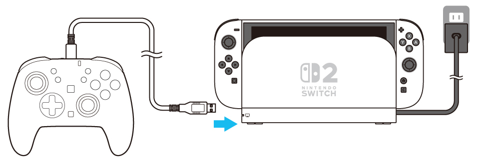 Connect the USB cable included with the Wireless HORIPAD Turbo to the Nintendo Switch 2 dock, or connect using the AC adapter included with the Nintendo Switch 2.
